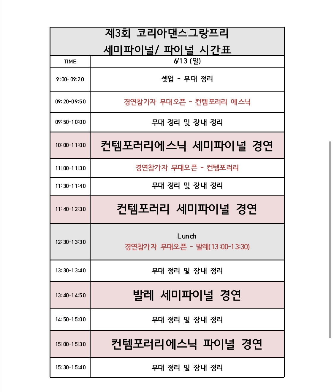 본선 (세미파이널, 파이널 ) 일정표 입니다. 위 일정표는 사정에 따라 변동 가능성이 있습니다.